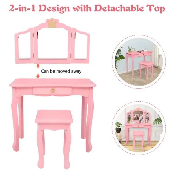 Kids Princess Vanity Table and Chair Set, Kids Vanity Set with Drawer & Tri-Folding Mirror