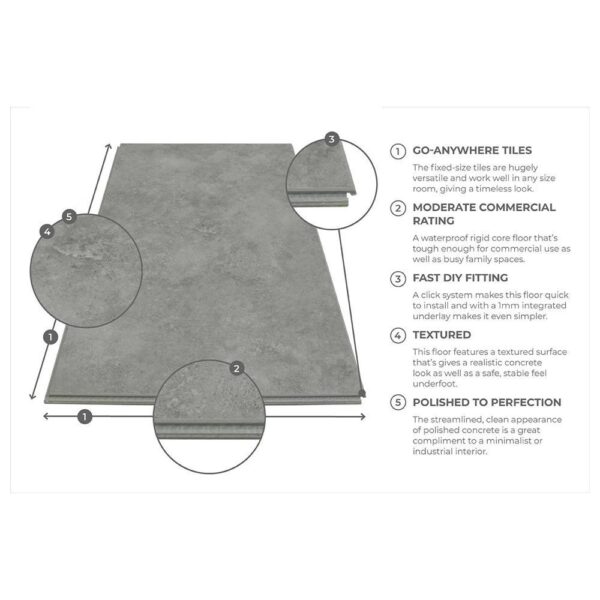 With a warm mid-grey tone and a streamlined appearance, this hardwearing floor features a textured surface and a softly mottled décor layer that add realism to its polished concrete look. This beautiful floor is made with Rigid Core Vinyl, also known as Stone Plastic Composite (SPC) is 100% waterproof, so it can be installed in all rooms throughout the house, including conservatories (being able to withstand surface temperatures up to 60oC), bathrooms, kitchens, and anywhere with underfloor heating systems up to 27oC. The fixed-size tiles (305mm x 610mm) with micro-bevelled edges will work well in any size of room and ensure a clean, contemporary finish.